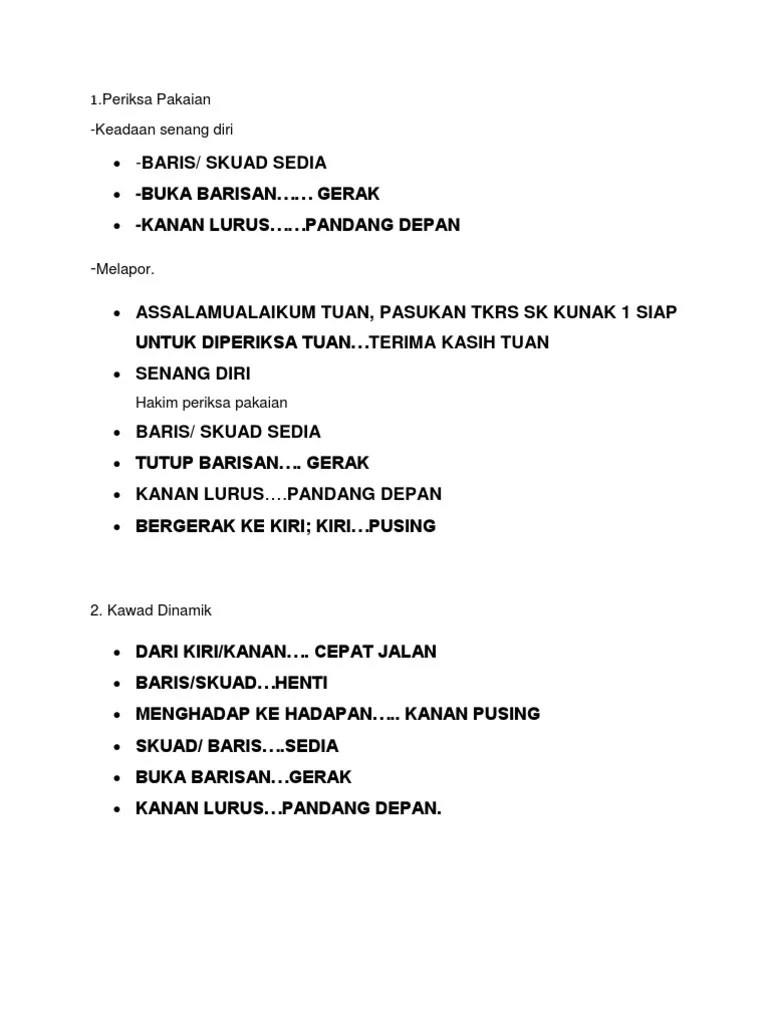 Doc apa itu kawat kaki zen k shatis academia edu. Buku panduan pbsm sumberpendidikan flip ebook pages 1 50 anyflip anyflip. Arahan kawad arahan kawad kaki kawad statik 1. Arahan kawad kaki arahan platun masuk ke padang kawad dari kanan… cepat jalan kanan belok 2x berhenti … Baris hadapan 1 langkah kiri . No bahasa hukuman kawad kaki 1. Arahan kawad kaki asas penuh. 2 dari kiri, cepat jalan. Baris dalam tiga barisan mengikut paras. 3 (berhenti di hadapan hakim . 8202019 arahan kawad kaki asas 14 arahan kawad kaki kawad statik 1. (dari tempat perhimpunan) baris bergerak ke kanan, ke kanan pusing. Baris dalamtiga barisan mengikut paras. Arahan kawad kaki asas · buku panduan pbsm sumberpendidikan flip ebook pages 1 50 anyflip anyflip · kawad statik pbsm mpg youtube · bahasa hukuman kawad persatuan . Baris dalam tiga barisan mengikut paras. Doc syarat kawad kaki fun mee fai academia edu.